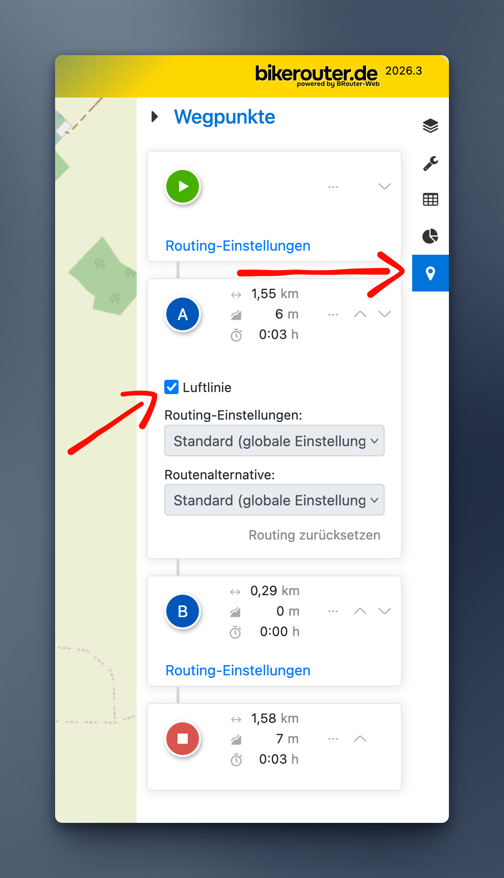 Alternatively, this can be specified in the routing settings of the waypoints sidebar: